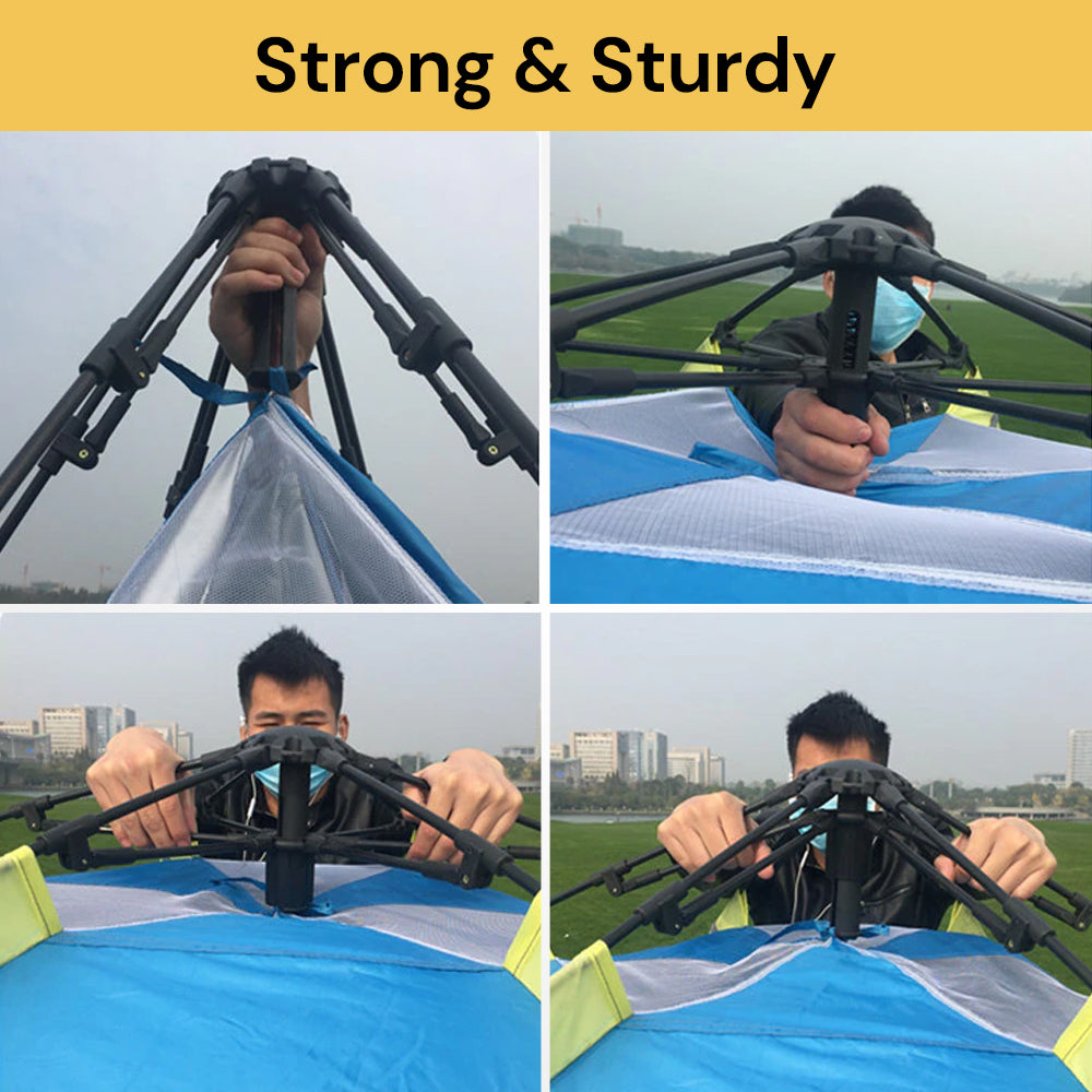 Pop up beach tent is very spacious for up to 6 people, the best choice for family sun shelter. The new frame is steel wire, more solid and lightweight, making the beach tent stably stand by itself and keep shape after a long time of use.