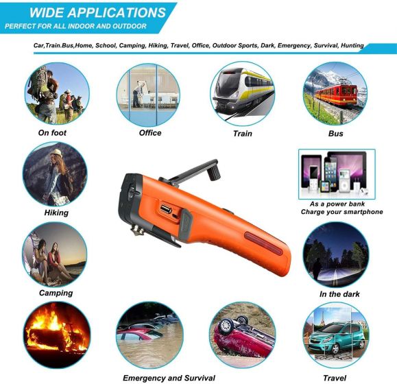 This multifunctional tool contains a car safety hammer, seat belt cutter, red light (SOS lighting), magnet, LED flashlight (bright/dim/flashing), USB charger with cables, and system of crank charging.