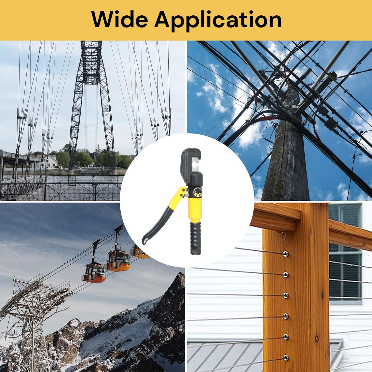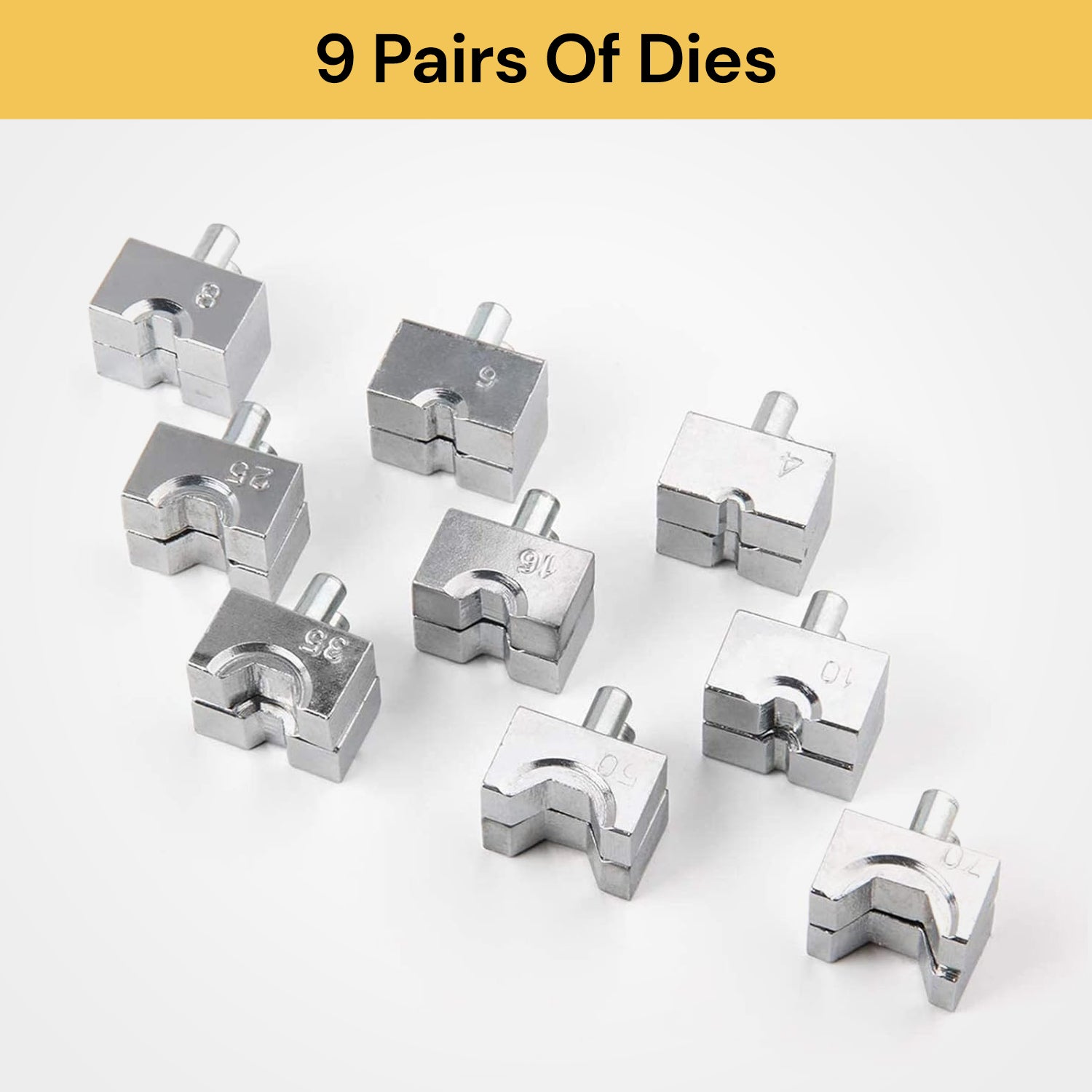This hydraulic crimper is made of durable material, high strength and good toughness. 9 pairs of dies are made of hardened steel with a chrome finish. It also provides increased stability for a longer service life.