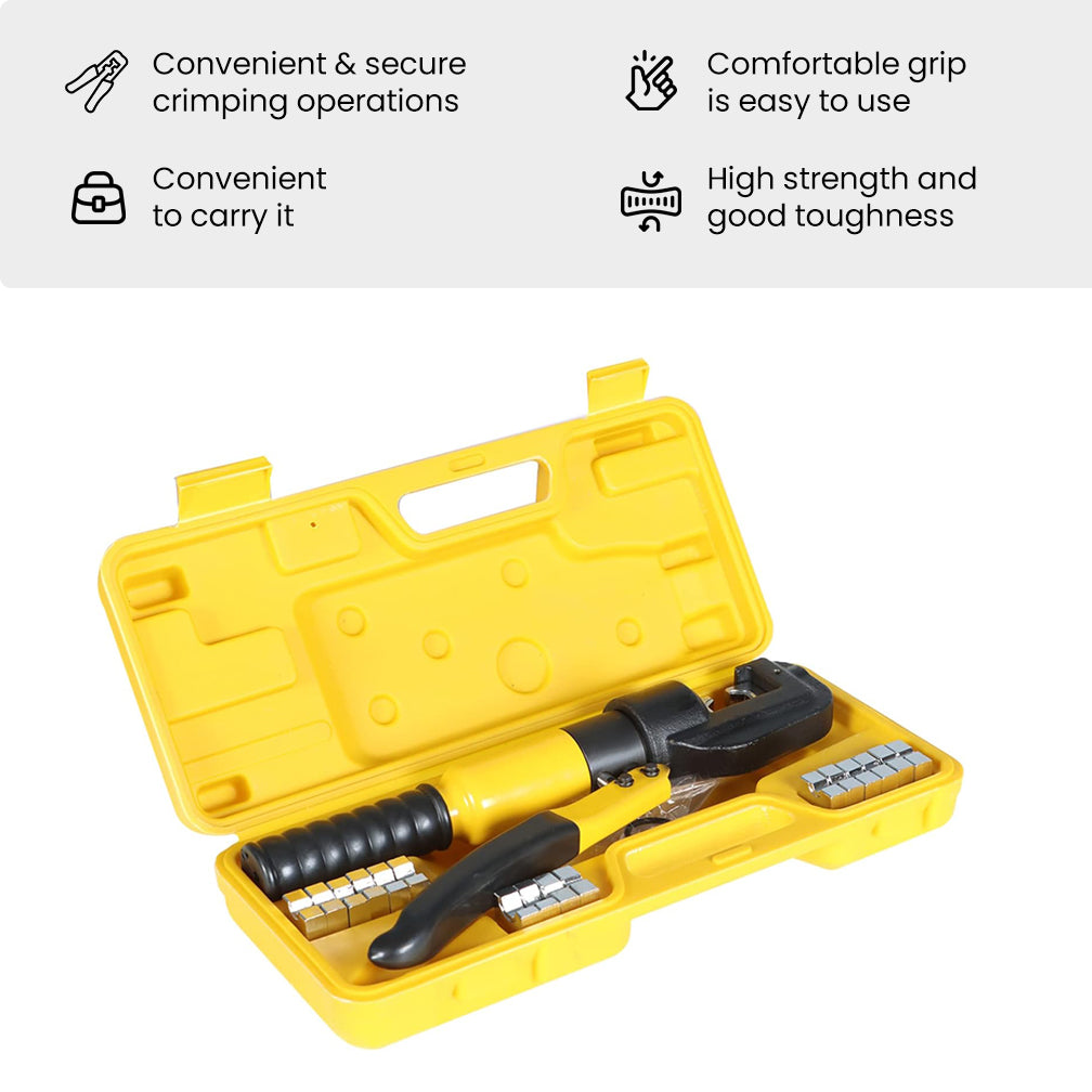 Crimping range is from 4 to 70 mm². Maximum crimping power: 8 tons. The stroke is 10mm. Hex Die Used: 4/6/8/10/16/25/35/50/70mm². Comes with a durable plastic box, And it will be pretty convenient for you to carry it out for work.